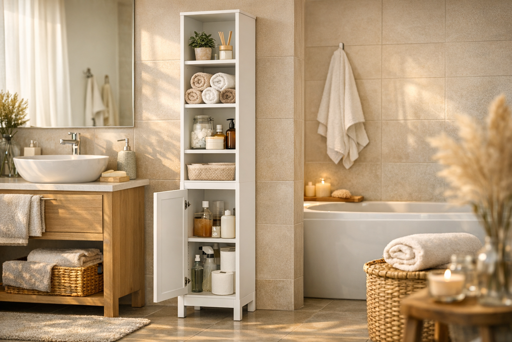 Dieser funktionale Hochschrank eignet sich hervorragend für kleine und größere Badezimmer. Die strukturierte Aufteilung bietet sowohl offene Ablagen als auch geschlossene Staufächer, sodass Sie persönliche Gegenstände diskret und griffbereit unterbringen können. Der Schrank ist aus robusten Materialien gefertigt, einfach zu montieren und pflegeleicht. Das moderne, neutrale Weiß sorgt für ein freundliches, hygienisches Gesamtbild in jedem Bad. Ideal für Familien, Singles oder als Gästezimmerlösung – überzeugen Sie sich selbst vom cleveren Stauraum-Konzept! Tipp: Auch perfekt einsetzbar in Hauswirtschaftsräumen oder Fluren dank schlanker Maße.