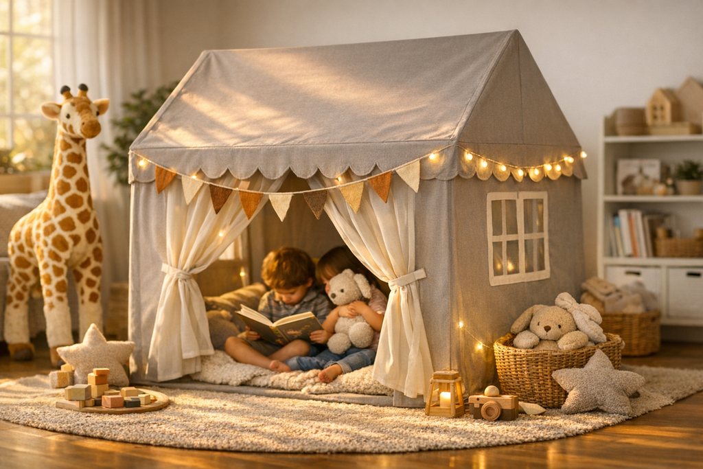 Dieses großzügige Kinderzelt Spielhaus verwandelt jedes Kinderzimmer oder jeden Garten in eine phantasievolle Oase! Dank der neutralen, stilvollen Farbgebung in Grau-Beige passt das Zelt zu jeder Einrichtung. Hochwertige Verarbeitung sorgt für Stabilität und Sicherheit beim Spielen. Die einfache Montage ermöglicht flexiblen Einsatz – ob drinnen oder draußen, das Spielhaus ist schnell aufgebaut und einsatzbereit.