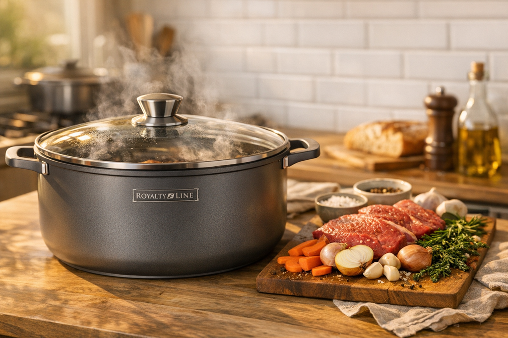 Ob großer Familienbraten, deftige Eintöpfe oder raffinierte Schmorgerichte – der Kochtopf Bratentopf mit 36 cm Durchmesser ist ein wahres Multitalent für jede Küche. Das robuste Material sorgt für schnelle, gleichmäßige Hitzeverteilung. Dank der großzügigen Größe eignet er sich perfekt für Feste oder den Alltag. Und das Beste? Durch unseren Lagerverkauf erhalten Sie diesen Kochtopf zum exklusiven Schnäppchenpreis – günstiger wird’s nicht! Nur solange der Vorrat reicht.