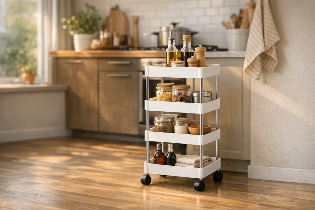 Dieses flexible Regal auf Rollen überzeugt mit gleich vier offenen Ablageflächen – ideal, um Küchenutensilien, Vorräte oder Reinigungsmittel platzsparend unterzubringen. Die stabile Metall- und Kunststoff-Kombination sorgt für eine hohe Tragfähigkeit, während das zeitlose Design in Weiß für frische Ordnung in jeder Umgebung sorgt. Besonders praktisch: Dank der Rollen lässt sich der Wagen mühelos an Ihren Wunschplatz schieben – perfekt auch als Servierwagen bei Feiern oder zum schnellen Umräumen. Durch seine schlanken Maße passt der Rollwagen auch in schmale Lücken – ideal für kleine Küchen, Bäder oder das Büro. Direkt aus unserem Lagerverkauf in Manching erhalten Sie dieses Multitalent viel günstiger als im regulären Handel – ein echtes Schnäppchen im Raum Ingolstadt für preisbewusste Haushalte. Restposten- und Einzelstück-Preise warten auf Sie: Nur solange der Vorrat reicht!